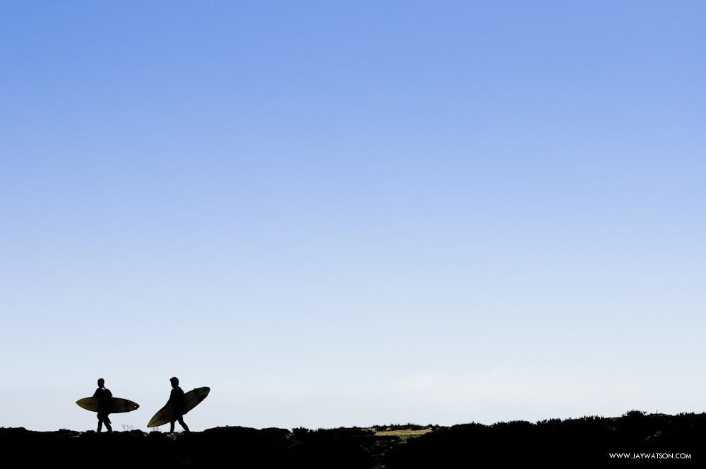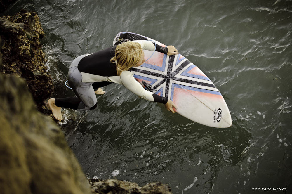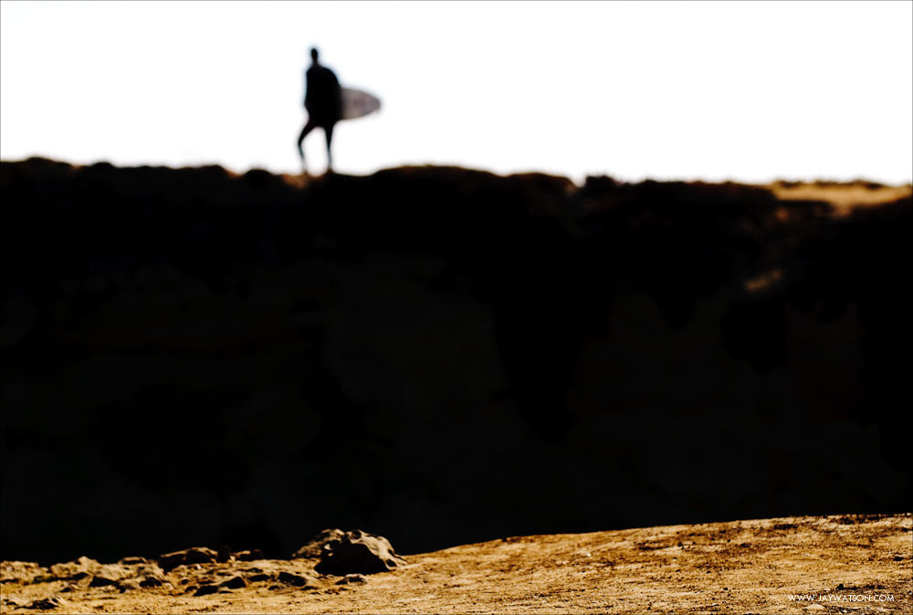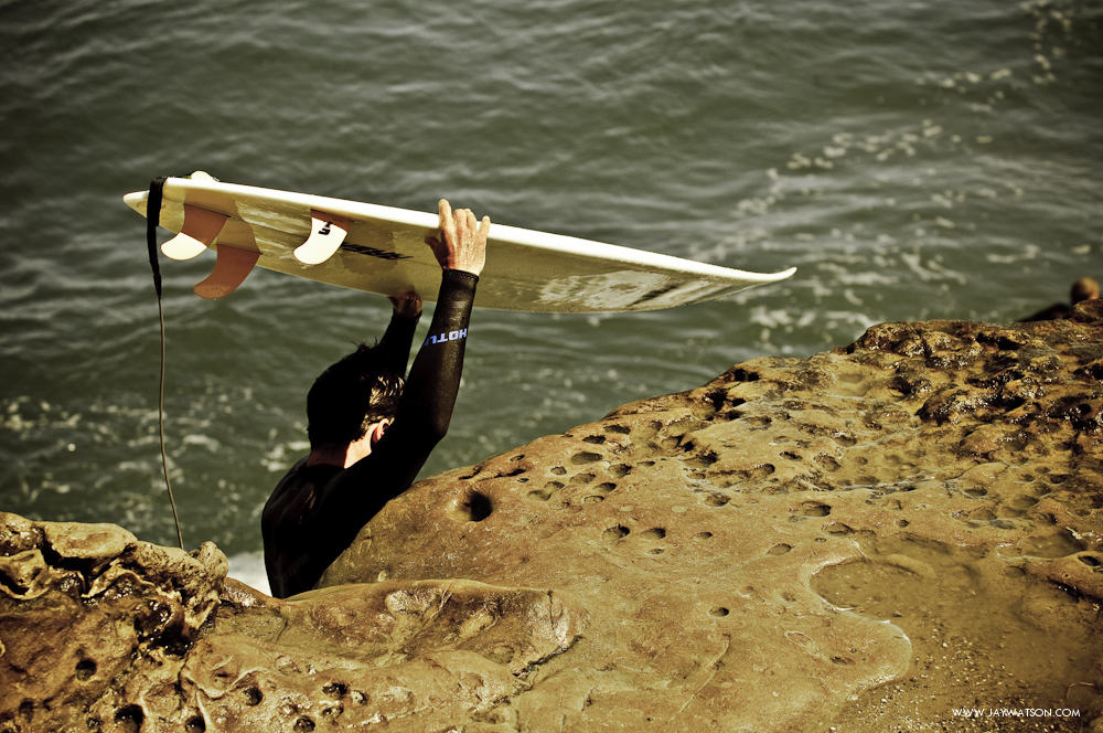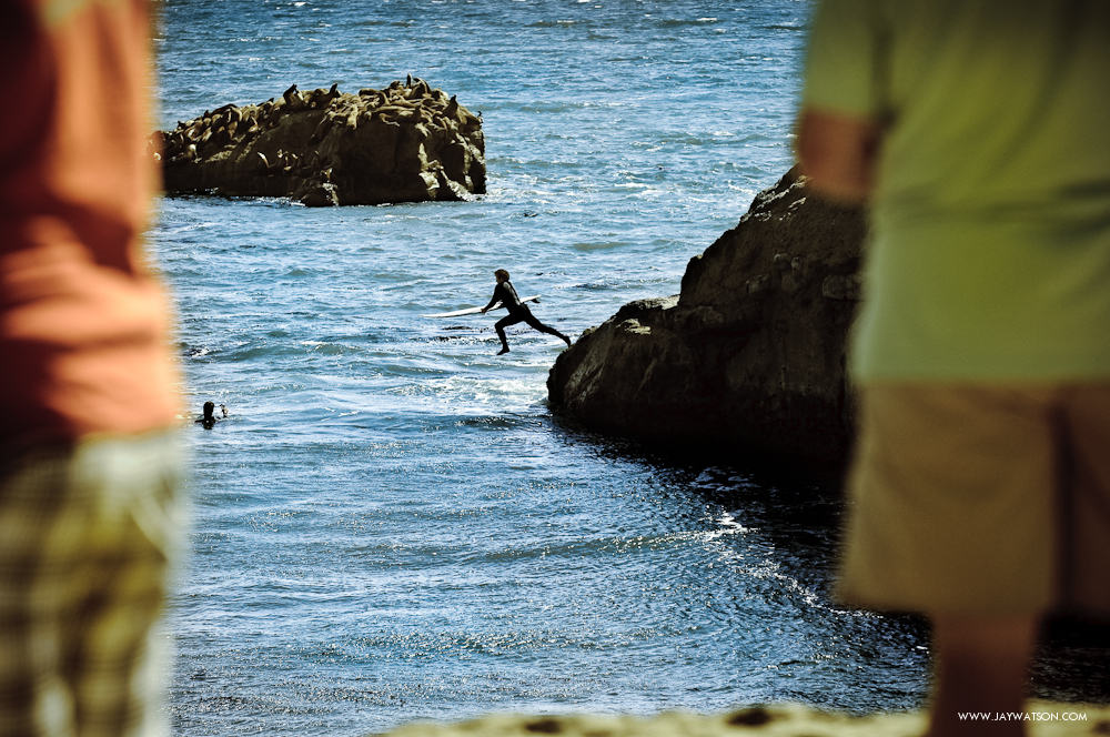 Surfers avoid the long paddle out from the beach by jumping off a nearby cliff and paddling out to the lineup. The veterans take the easy access route by walking on the cliff that runs past the break. They slip past the barking seals, and then make the short free fall into the ocean. The younger groms must not like the longer walk. This cuts into their surf time. They practice their rock climbing skills with crab-like maneuvers, and use their grommet toes to scale the wall closest to the break.