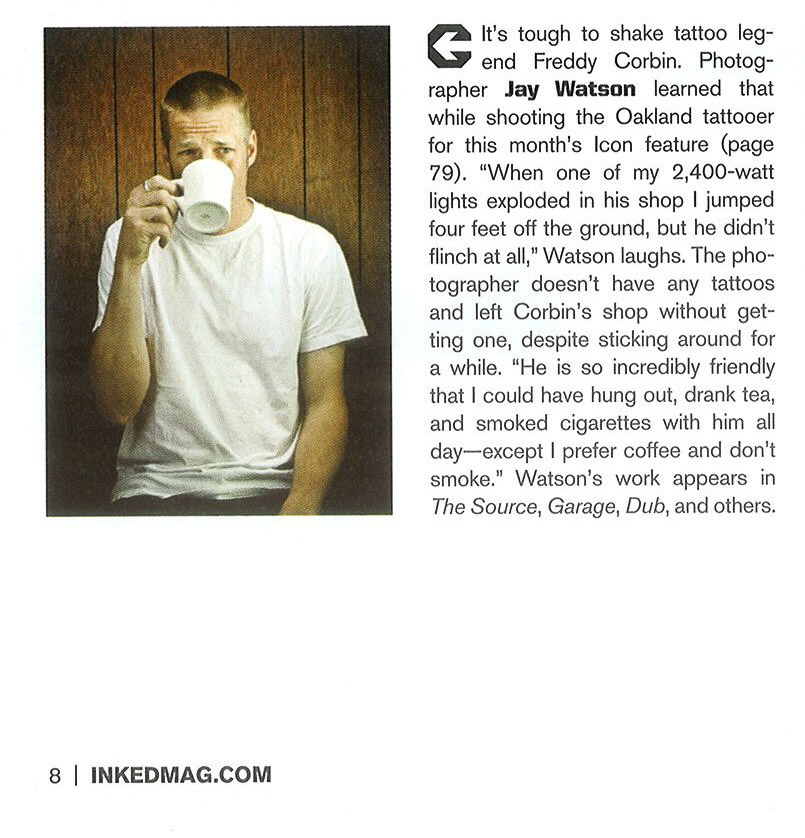 The November issue of Inked Magazine features a multi page piece I shot of Oakland tattoo artist Freddy Corbin (not without incident, see below) for the “Icons” section. This may not be the most timeliest piece of news but hey, it was a fairly busy month. Mr. Corbin also makes an appearance in the season finale of Sons Of Anarchy which airs this week on FX. SOA is a soap opera filled with guns, snitches, politics, and thugs. Freddy is too nice for any of those parlor games so I look forward to seeing his cameo.