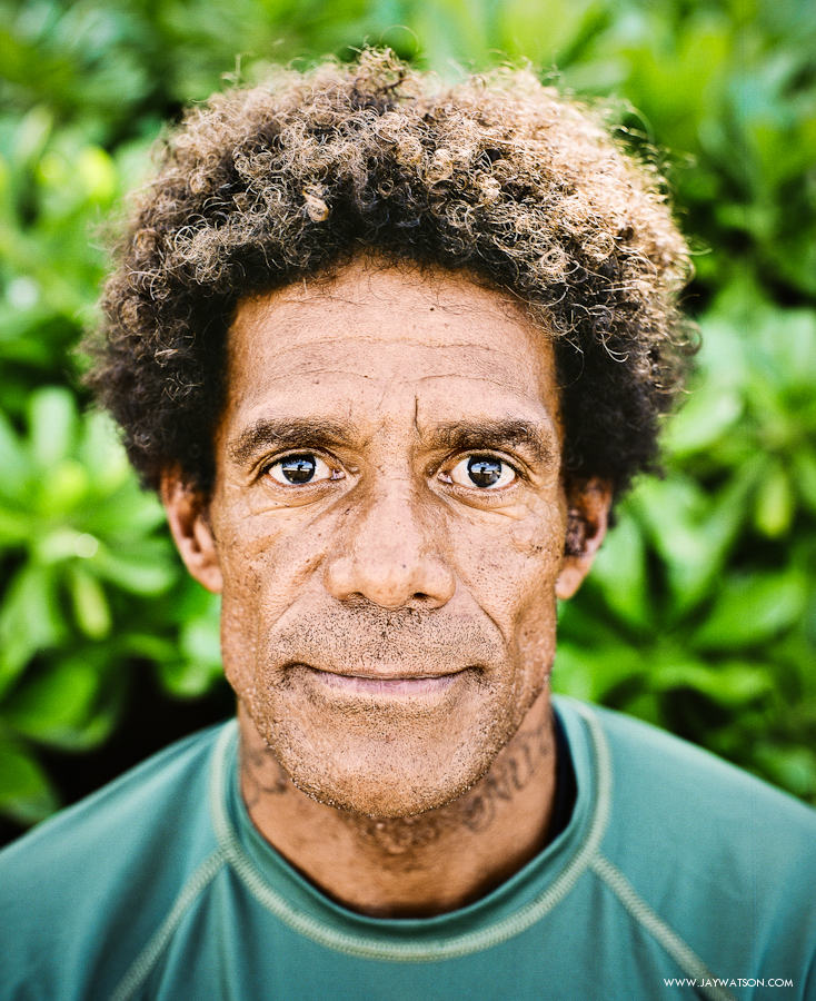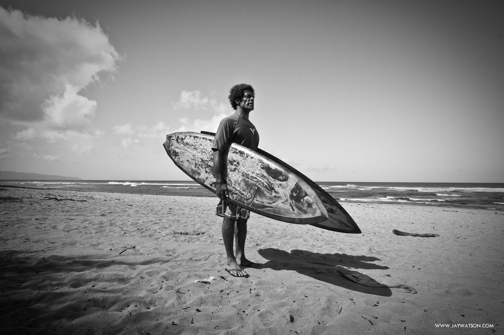 I had the honor of photographing pro surfer, icon, and North Shore legend Buttons Kaluhiokalani at his home break in Oahu, Hawaii. Upon first meeting Mr. Kaluhiokalani he was washing sand off his feet and stowing away a surfboard from his morning session. It was a fitting first impression. There is a tradition in Hawaii when you visit someone’s home that you should bring a gift. Food or drink is always welcome so Jamie and I brought a chocolate haupia cream pie from Ted’s Bakery, a North Shore favorite for both locals and tourists.