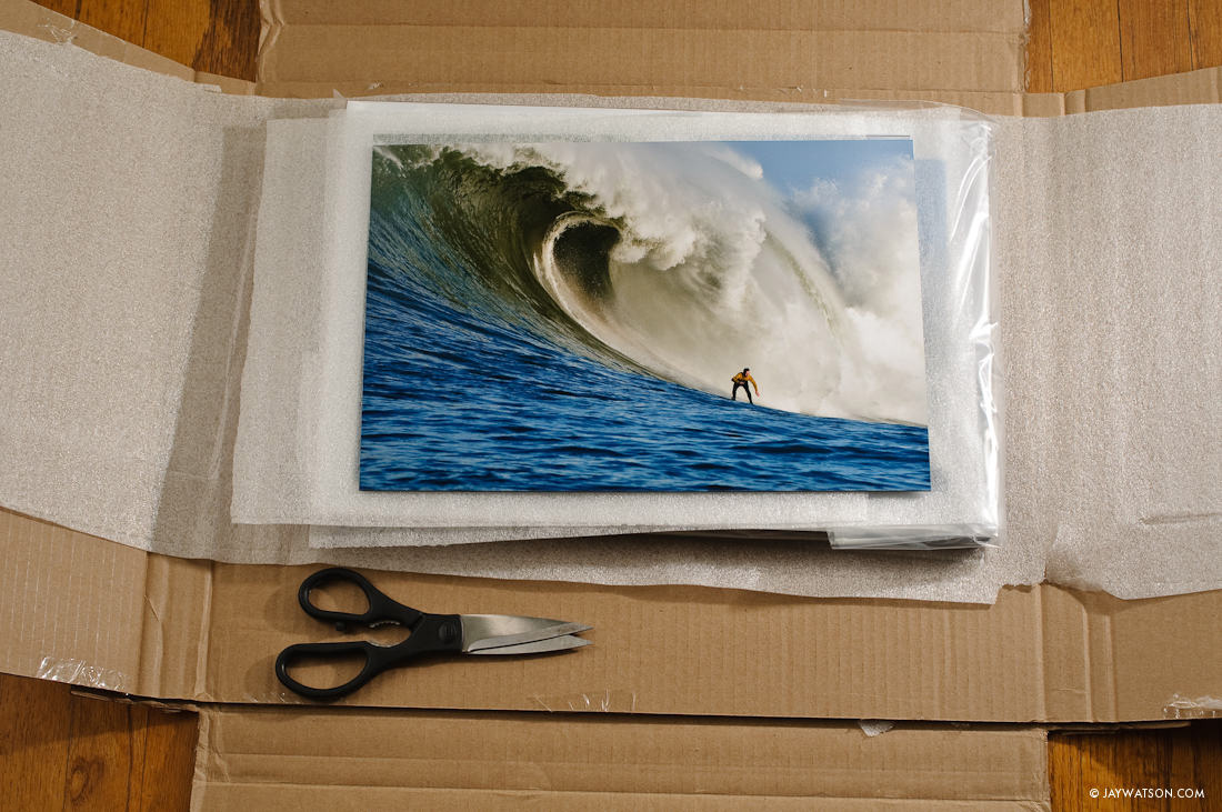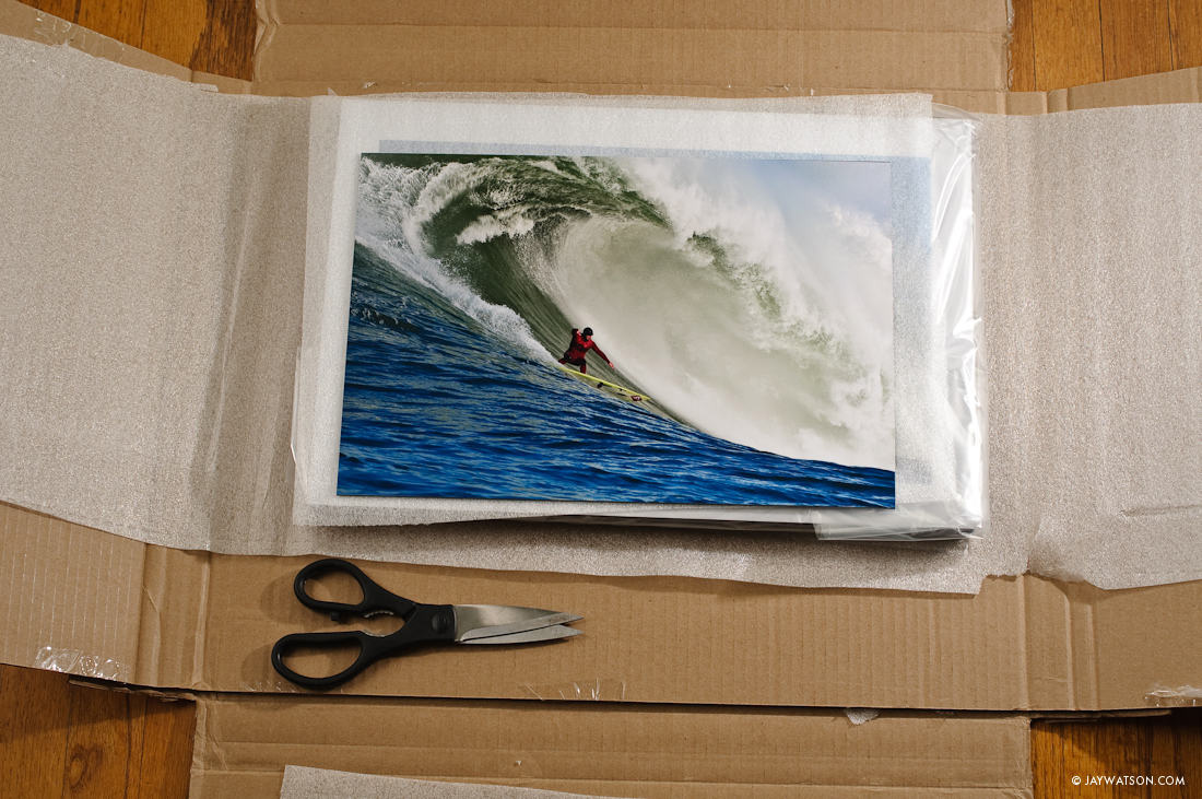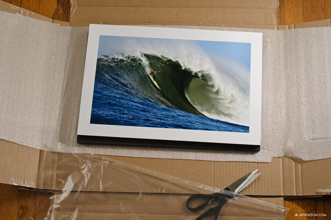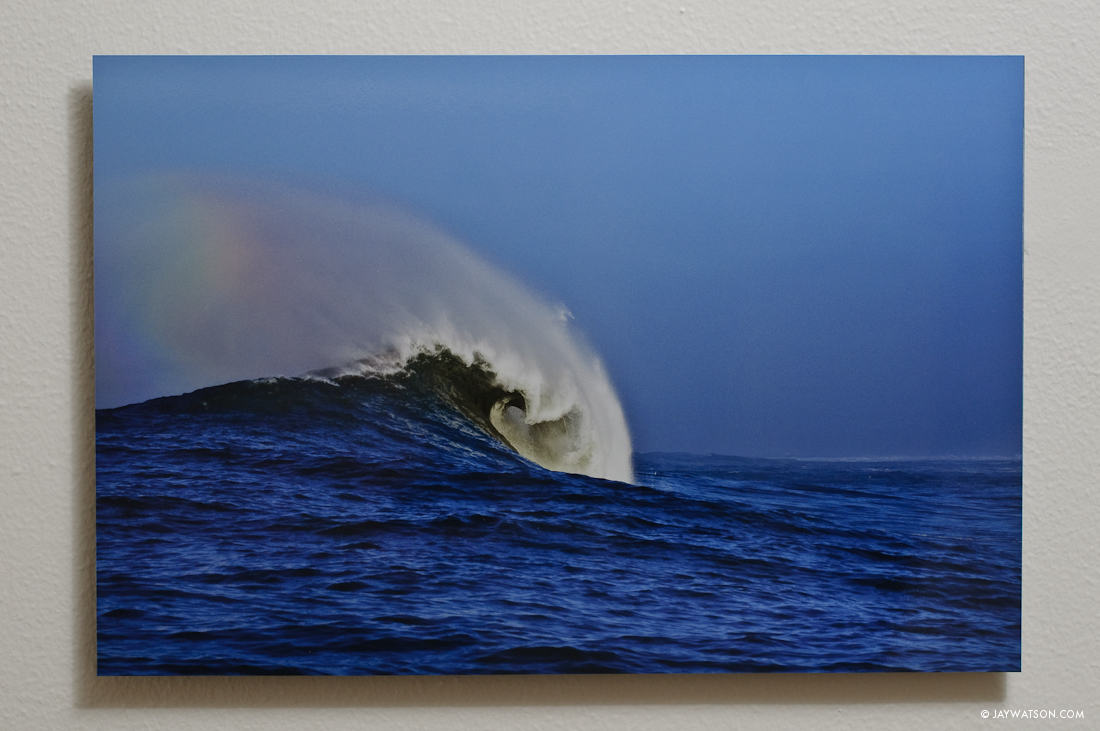 This 10″ X 15″ of Mavericks printed on metallic paper stays here, mounted on 3mm sintra and “floated” off the wall.