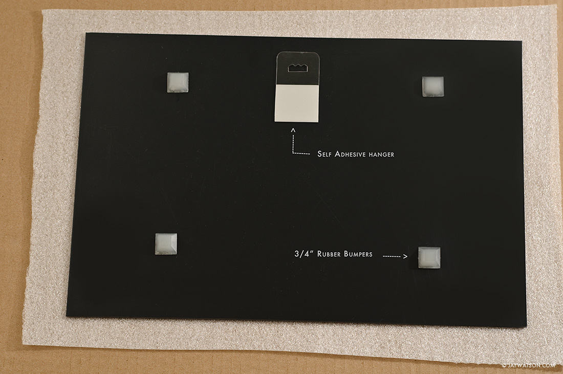 4) “Float” the mounting material away from the wall. Many framers and labs mount a smaller piece of 1/2 gatorboard behind the dry mounted photo. The easiest solution is to use thick self-adhesive rubber bumpers found on Amazon and Home Depot. Place one at each corner of the print about 4 inches toward the center to hide their appearance.