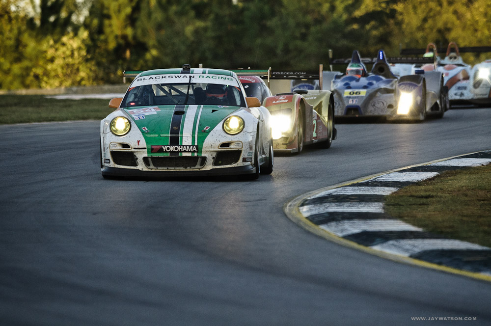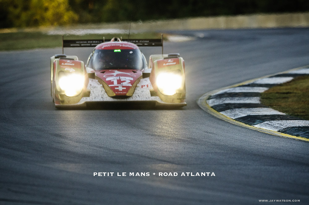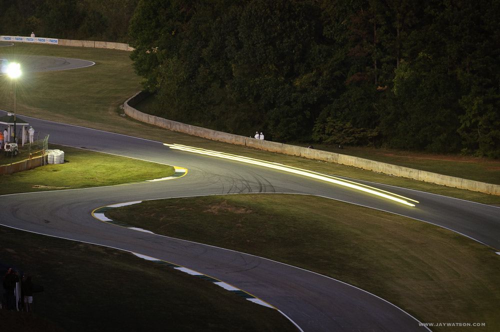 Since Le Mans races are either 12 or 24 hour sporting events, I had the opportunity to shoot motor sport racing at dusk. This is also a time when the track is considered faster for several reasons. Tires have good traction since the course is still warm, visibility is better than overhead mid day sun, drivers are familiar with their lines, and as the air cools engines run a little quicker. The headlights also became highly noticeable. They’re moving at laser speed. This unexpected light show overtop of the pounding engines was not a sensory overload. It was Petit Le Mans, and unlike any other experience I’ve had on the job.