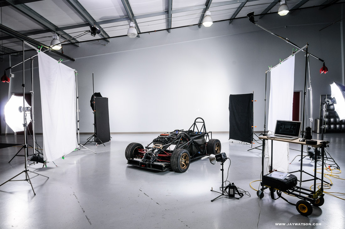 Behind the scenes set up for the car studio shots. 8 lights and 2 power packs, 13-14 light stands. A new technique for shooting cars has involved walking around the set and hitting each wheel with a gridded strobe while the camera is on a tripod. The images are then combined in Photoshop. It saves time on the set and reduces the amount of equipment needed.