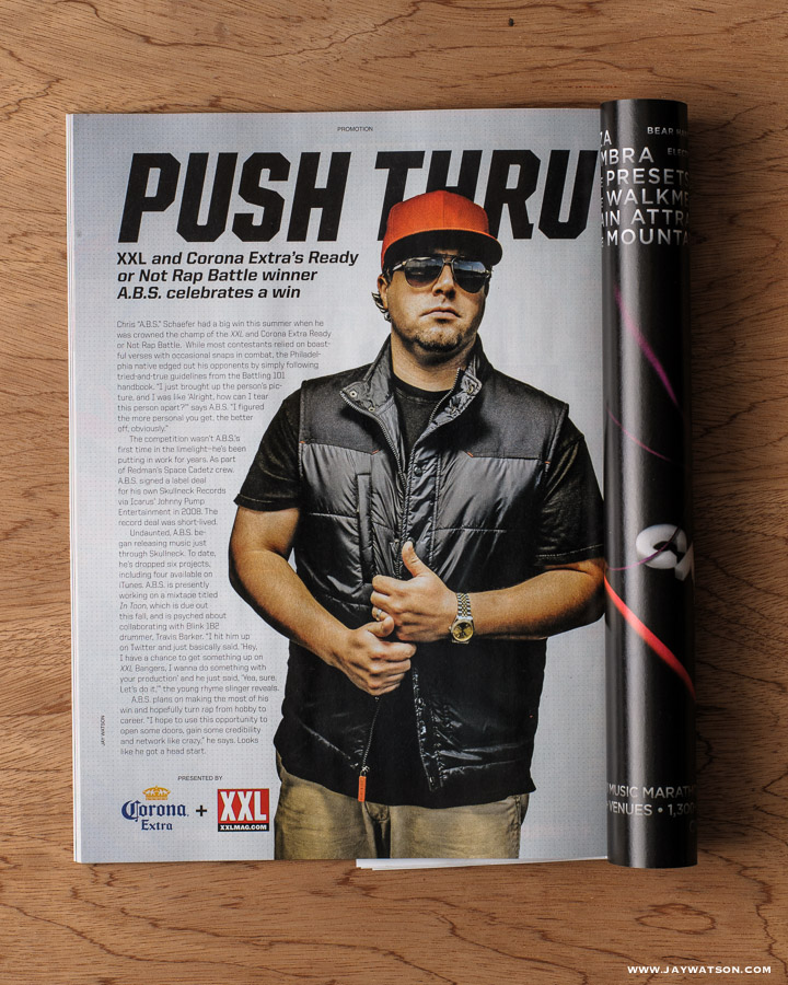 The hip hop music and entertainment magazine XXL Mag got in touch for a piece on Philly born rapper Chris “A.B.S.” Schaefer in San Francisco. He was the winner of a rap battle sponsored by Corona, so XXL assigned me to photograph A.B.S for a full page feature. Ahh….. the full page editorial portrait. This is the holy grail of editorial photography and a highly coveted space for any portrait photographer. God bless print.