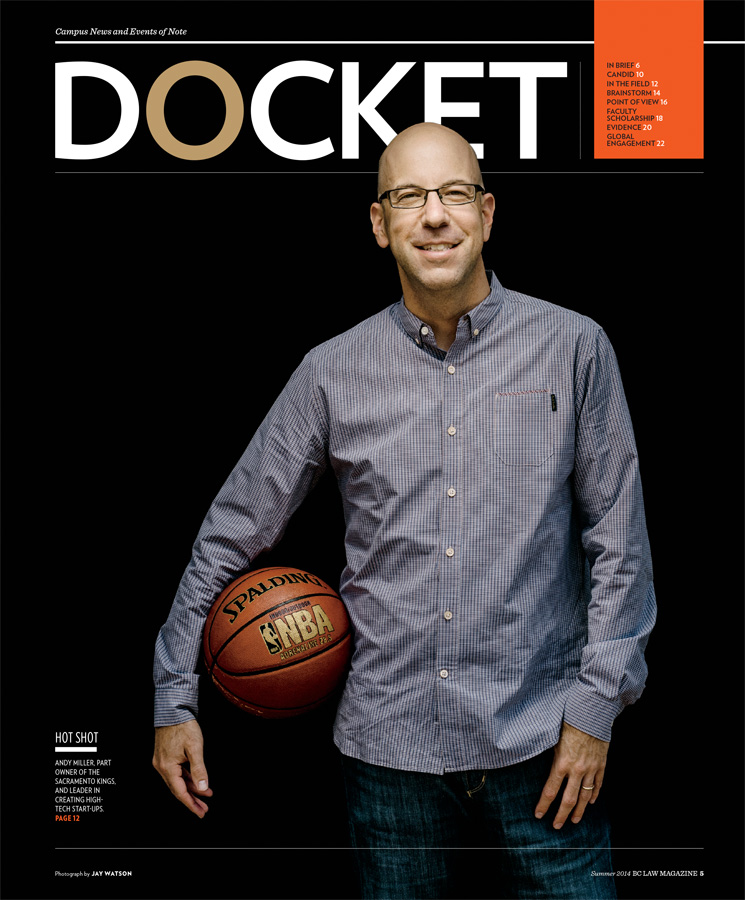 Editorial portraits of Andy Miller, former Apple executive and co-owner of the Sacramento Kings NBA team. Photographed at his home in Palo Alto, CA for the cover of Boston College Law School Magazine.