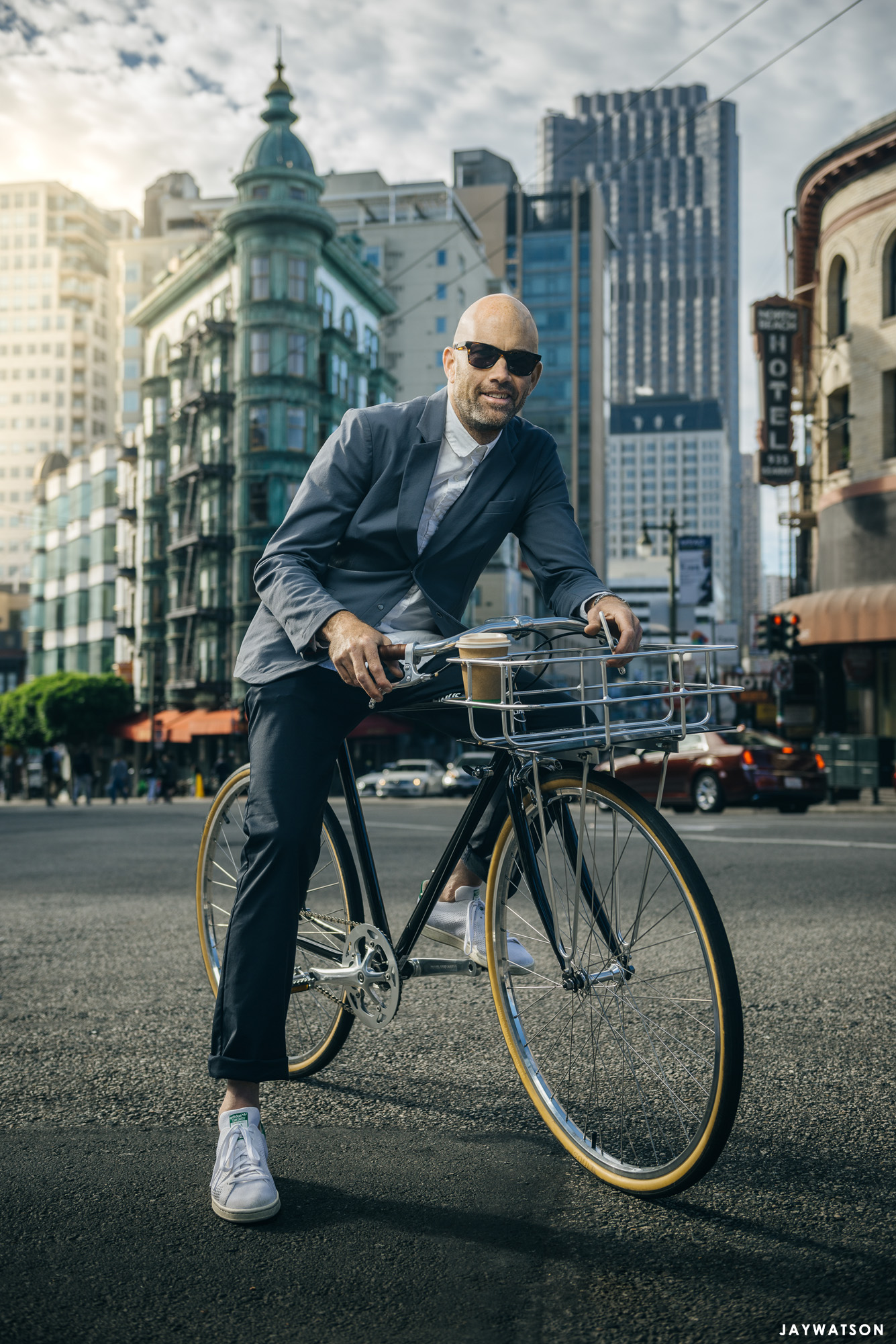 Life would be less fun without photography or bikes. This shoot included both. Below are images from an editorial portrait shoot in San Francisco for a Bicycling Magazine piece titled: “The Secret To No Sweat Commuter Style.” The subject was menswear designer and cyclist Vaughn Brown of Parker Dusseau.