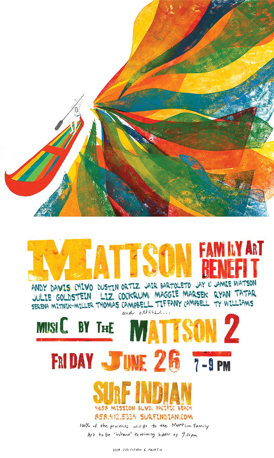 Mattson Family Art Benefit, June 26th San Diego, CA at Surfindian. Poster art by Julie Goldstein. Links to artists and more details.