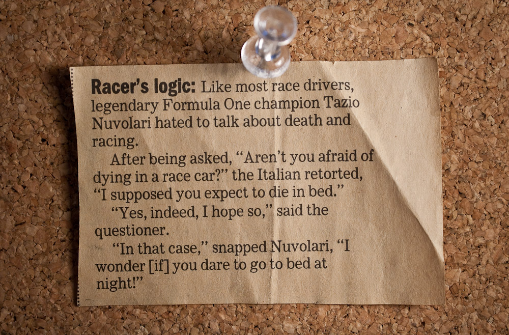 I have saved this newspaper clipping from the LA Times for 10 years, and cut it out from a story when I was getting the paper delivered daily when I first moved to California. Wish I had a chance to photograph Nuvolari. Sounded like an interesting guy.